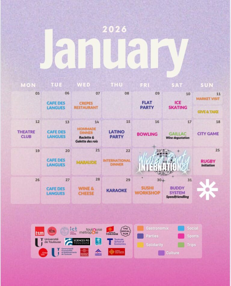 Through our events, volunteers enable students to enjoy moments of joy and good humor, but also to meet new people, regardless of the party, the destination of the trip, the type of cultural outing, sporting activity, type of solidarity drive or culinary desire.